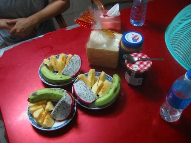 We get an assortment of fruit, including my and Janina’s favorite, dragonfruit (the purple one). We also usually have some kind of bread product, most often peanut butter and jelly but sometimes baguettes, pastries, or (once) leftover sticky rice wraps from Pchum Ben.