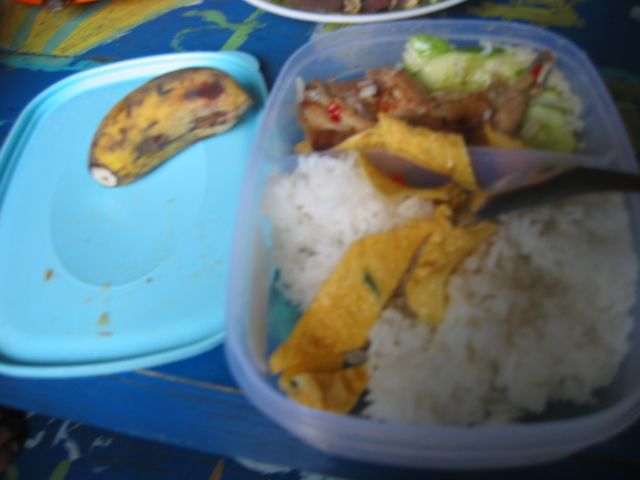 Although I’ve been staying at the school for lunch, it’s made in the mornings by Mami (or Kuoch on the days when Mami is gone). Generally it’s “rice, eggs, meat, vegetable, plus a banana”, and the vegetable is usually cucumber. I always feel a little guilty at school having such a rich lunch, although I shared the teachers’ lunch one day when I forgot the packed lunch (“Tngai nih, at mien bai knyom…”), and it wasn’t bad.